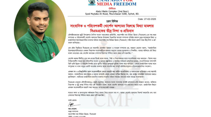 মৌলভীবাজার জেলার জুড়ী উপজেলার দৈনিক দৈনিক সংবাদ সারাবেলা-এর প্রতিনিধি, ক্যাম্পেইন ফর মিডিয়া ফ্রিডম (সিএমএফ)-এর সহ-দপ্তর সম্পাদক ও পরিবেশকর্মী খোর্শেদ আলমের বিরুদ্ধে উপজেলা বাংলাদেশ জাতীয়তাবাদী দল (বিএনপি)র সাধারণ সম্পাদক মতিউর রহমান চুনুর দায়ের করা মামলাকে ‘মিথ্যা ও রাজনৈতিক উদ্দেশ্যপ্রণোদিত’ আখ্যা দিয়ে গভীর উদ্বেগ, তীব্র নিন্দা ও প্রতিবাদ জানিয়েছে সিএমএফ। এক যৌথ আরো সংবাদ পড়ুন...