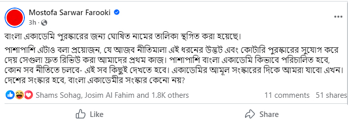 পরে বাংলা একাডেমিও এই সিদ্ধান্তের কথা জানিয়েছে। মোস্তফা সরয়ার ফারুকী তার ফেসবুকে লেখেন, ‘বাংলা একাডেমি পুরস্কারের জন্য ঘোষিত নামের তালিকা স্থগিত করা হয়েছে। পাশাপাশি এটাও বলা প্রয়োজন, যে আজব নীতিমালা এ ধরনের উদ্ভট এবং কোটারি পুরস্কারের সুযোগ করে দেয় সেগুলা দ্রুত রিভিউ করা আমাদের প্রথম কাজ। পাশাপাশি বাংলা একাডেমি কীভাবে পরিচালিত হবে, কোন সব নীতিতে চলবে- এসব কিছুই দেখতে হবে। একাডেমির আমূল সংস্কারের দিকে আমরা যাবো এখন। দেশের সংস্কার হবে, বাংলা একাডেমি সংস্কার কেন নয়?’