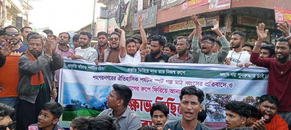 কমলগঞ্জে গল্ফ মাঠ খুঁড়ে চা-রাবার গাছ রোপণ, পর্যটন কেন্দ্র রক্ষায় বিক্ষোভ