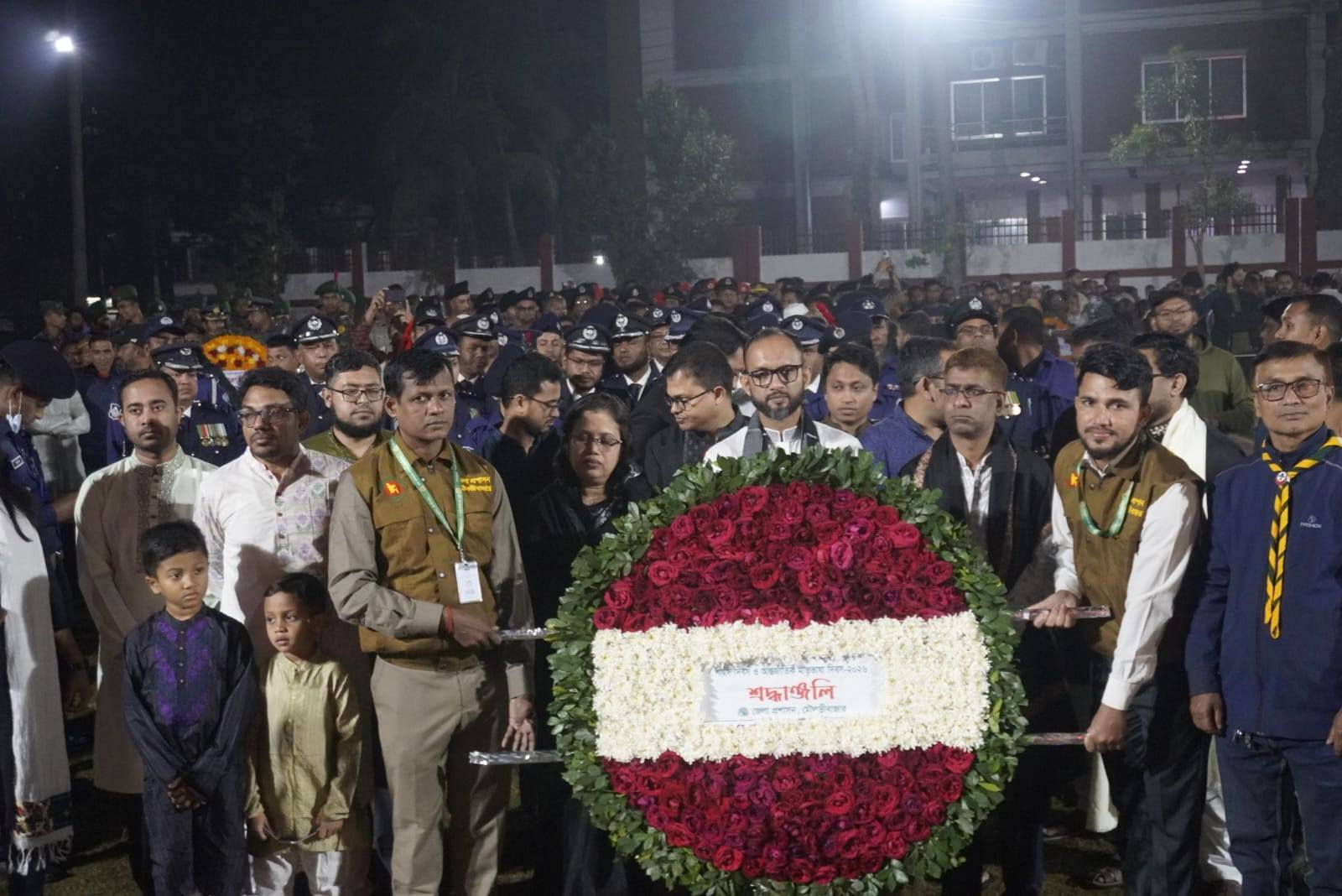 যথাযোগ্য মর্যাদা ও গভীর শ্রদ্ধার মধ্য দিয়ে মৌলভীবাজারে পালিত হয়েছে মহান শহীদ দিবস ও আন্তর্জাতিক মাতৃভাষা দিবস ২০২৬। একুশের প্রথম প্রহরে রাত ১২টা ১ মিনিটে মৌলভীবাজার সরকারি উচ্চ বিদ্যালয়ের মাঠে অবস্থিত কেন্দ্রীয় শহীদ মিনারে ভাষা শহীদদের প্রতি প্রথম শ্রদ্ধার্ঘ্য অর্পণ করেন জেলা প্রশাসক ও বিজ্ঞ জেলা ম্যাজিস্ট্রেট তৌহিদুজ্জামান পাভেল। এরপর জেলা পুলিশের পক্ষে শ্রদ্ধা নিবেদন করেন পুলিশ সুপার মোহাম্মদ বিল্লাল হোসেন।