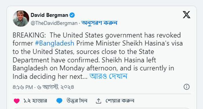 এদিকে, সামাজিক যোগাযোগমাধ্যম এক্সে দেওয়া এক পোস্টে ব্রিটিশ সাংবাদিক ডেভিড বার্গম্যান শেখ হাসিনার যুক্তরাষ্ট্রের ভিসা বাতিলের তথ্য জানিয়েছেন। তিনি লিখেছেন, মার্কিন সরকার বাংলাদেশের সাবেক প্রধানমন্ত্রী শেখ হাসিনার ভিসা প্রত্যাহার করেছে। পররাষ্ট্র দপ্তরের ঘনিষ্ঠ সূত্র এই তথ্য নিশ্চিত করেছে বলে এক্সে জানিয়েছেন বার্গম্যান।