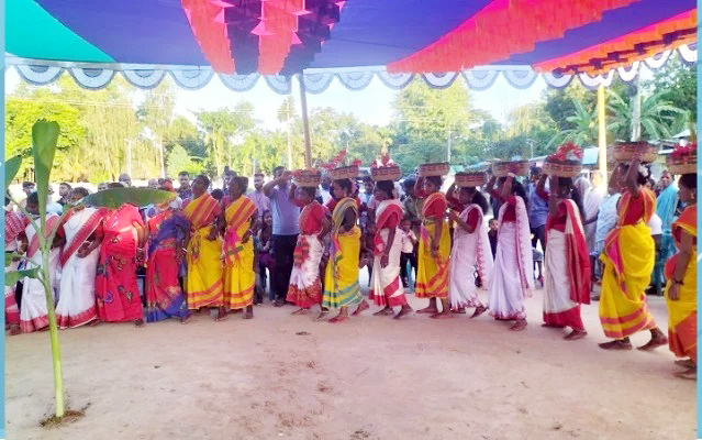রঙিন শাড়ি, ফুলে সাজানো চুল, মাথায় সাজানো ঝুড়ি আর তালমিলিয়ে নাচ- সব মিলিয়ে চারপাশে সৃষ্টি হয়েছিল এক অনন্য আবহ।