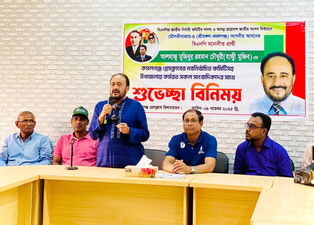 বাংলাদেশ জাতীয়তাবাদী দল বিএনপির জাতীয় নির্বাহী কমিটির সদস্য ও আসন্ন ত্রয়োদশ জাতীয় সংসদ নির্বাচনে মৌলভীবাজার-৪ (শ্রীমঙ্গল-কমলগঞ্জ)আসন থেকে বিএনপি মনোনীত ধানের শীষের প্রার্থী আলহাজ্ব মুজিবুর রহমান চৌধুরী (হাজ্বী মুজিব) বলেছেন, আসন্ন জাতীয় নির্বাচনে আমি নির্বাচিত হলে কমলগঞ্জের কৃষি ও পর্যটন শিল্পের উন্নয়নে কাজ করবো।তিনি বলেন, আমি নিজেও একজন কৃষকের সন্তান,এলাকার কৃষি খাতে উন্নয়ন হবে আমার প্রথম কাজ,ধলাই নদীর বন্যা প্রতিরক্ষা বাঁধের কারনে বর্ষায় প্রায়ই বন্যা কবলিত হয় কমলগঞ্জের অনেক অঞ্চল, এতে ক্ষতিগ্রস্ত হন আমাদের কৃষক।টেকসই প্রতিরক্ষা বাঁধ নির্মাণ ও যেহেতু কমলগঞ্জ -শ্রীমঙ্গল একটি পর্যটন সমৃদ্ধ এলাকা,এ শিল্পের উন্নয়নে আমি সাংবাদিকদের নিয়ে অগ্রণী ভূমিকা রাখতে চাই।