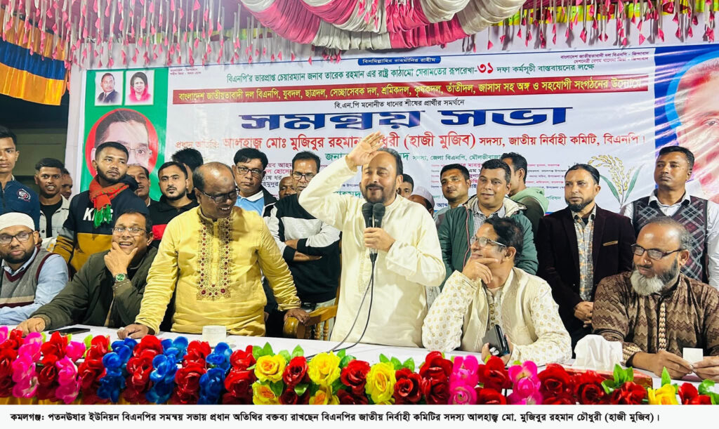 বিএনপির জাতীয় নির্বাহী কমিটির সদস্য ও মৌলভীবাজার-৪ (শ্রীমঙ্গল-কমলগঞ্জ) আসনের বিএনপি মনোনীত প্রার্থী আলহাজ্ব মুজিবুর রহমান চৌধুরী (হাজী মুজিব) বলেছেন, দেশে স্থিতিশীলতা ও গণতন্ত্র পুনরুদ্ধার করতে নির্বাচিত সরকারের কোন বিকল্প নেই। দল যাকে মনোনয়ন দেবে, বিএনপির প্রতিটি নেতাকর্মী তার পক্ষে কাজ করবে। ধানের শীষের পক্ষে গণজোয়ার দেখে ভীত হয়ে কতিপয় রাজনৈতিক দল অযৌক্তিক দাবি তুলে নির্বাচন বাধাগ্রস্ত করতে নানা ষড়যন্ত্র করছে। মানুষ গত ১৫ বছর ভোট দিতে পারেনি।