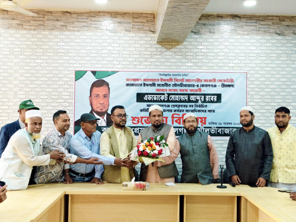 বাংলাদেশ জামায়াতে ইসলাম ক্ষমতায় গেলে সকলকে নিয়ে ইনসাফের বাংলাদেশ প্রতিষ্ঠা করা হবে বলে মন্তব্য করেছেন মৌলভীবাজার-৪ (শ্রীমঙ্গল-কমলগঞ্জ) আসনে জামায়াতে ইসলাম প্রার্থী অ্যাডভোকেট মোহাম্মদ আব্দুর রব। শুক্রবার (২৮নভেম্বর) দুপুরে কমলগঞ্জ প্রেসক্লাবে উপজেলায় কর্মরত সাংবাদিকদের সাথে শুভেচ্ছা বিনিময় করছেন।