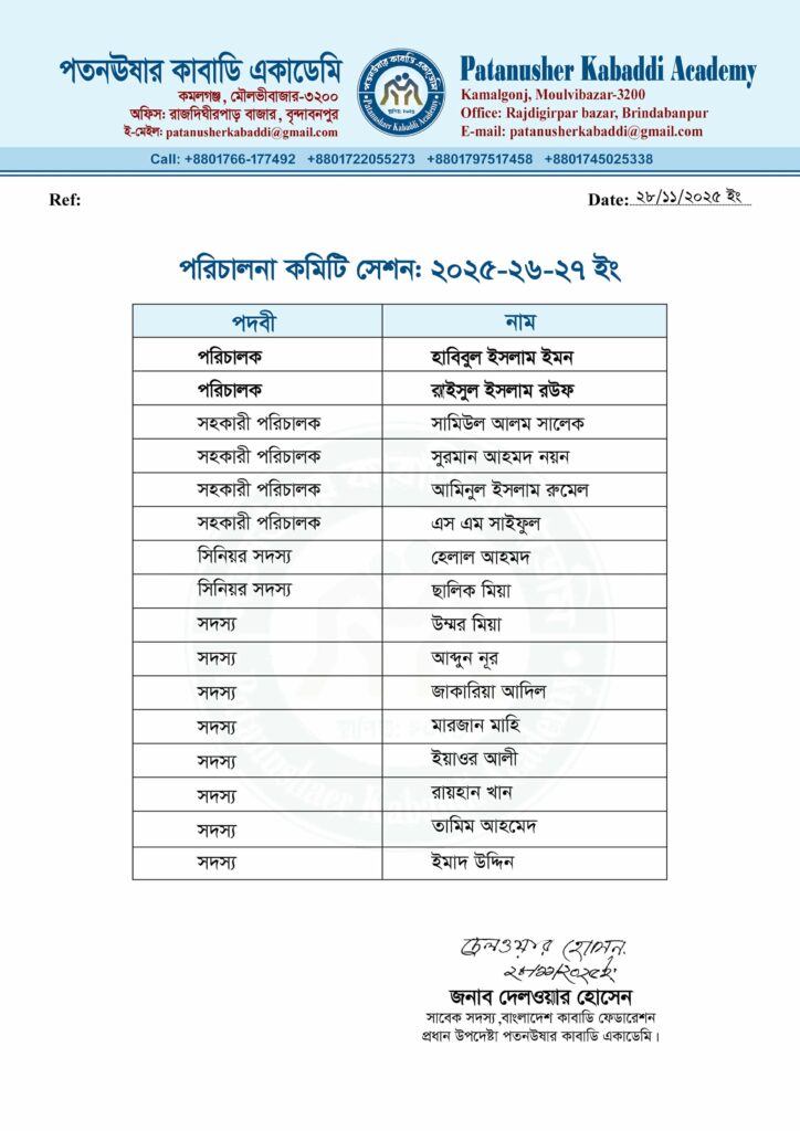 বাংলাদেশ কাবাডি ফেডারেশন এর সাবেক সদস্য ও মৌলভীবাজার জেলা কাবাডি দলের কোচ, একাডেমির প্রধান উপদেষ্টা দেলওয়ার হোসেন এর সাক্ষরে কমিটি চূড়ান্ত করা হয়।