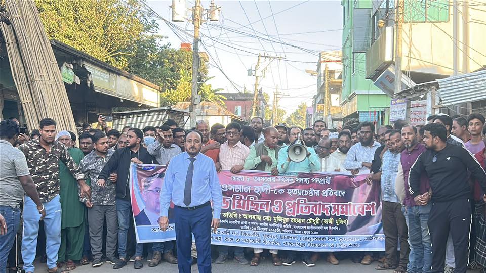ইনকিলাব মঞ্চের মুখপাত্র ও ঢাকা-৮ আসনের সংসদ সদস্য পদপ্রার্থী শরিফ ওসমান হাদীকে গুলি করে হত্যাচেষ্টার প্রতিবাদে মৌলভীবাজারের বিক্ষোভ মিছিল ও প্রতিবাদ সমাবেশ করেছে উপজেলা বিএনপি ও অঙ্গ সহযোগী সংগঠন।