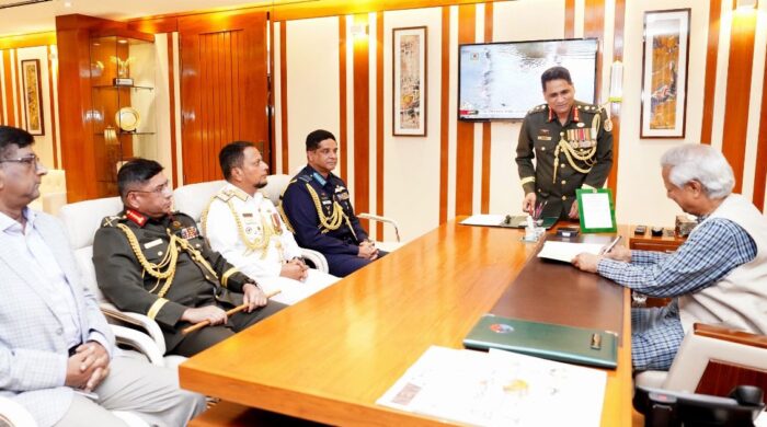 অন্তর্বর্তীকালীন সরকারের প্রধান উপদেষ্টা প্রফেসর ড. মুহাম্মদ ইউনূস মহান স্বাধীনতা যুদ্ধে আত্মোৎসর্গকারী সশস্ত্র বাহিনীর শহীদ সদস্যদের প্রতি শ্রদ্ধা জানিয়েছেন। এরপর তিনি সশস্ত্র বাহিনী বিভাগে নিজের কার্যালয়ে অফিস করেন। আজ বৃহস্পতিবার