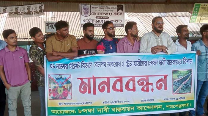 আখাউড়া-সিলেট রেল সেকশনে বন্ধ সকল রেল স্টেশন চালুকরনসহ ৮ দফা দাবি বাস্তবায়নের দাবিতে আগামী ১লা নভেম্বর সিলেট টু শায়েস্তাগঞ্জ রেলপথ অবরোধ সমর্থনে মৌলভীবাজারের কমলগঞ্জ উপজেলার শমশেরনগর রেলওয়ে স্টেশনে মানববন্ধন ও